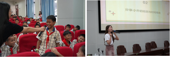 【智慧课堂】 第六教学楼内,广西大学的蒋老师以"探索西大·发现自己·启迪未来"为主题,,带领孩子们完成了一场"沉浸式校园导览",拓宽了同学们的视野,种下了科学的种子。广西大学两位优秀的学长学姐代表,则用成长时间轴的形式分享了自己小升初的成长感悟并带领大家畅想未来的大学生活。