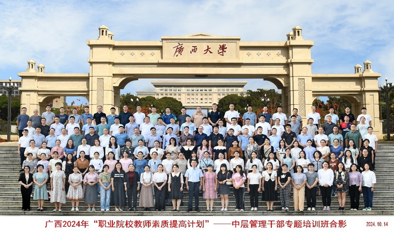10月14日上午,广西2024年“职业院校教师素质提高计划”——中层管理干部专题培训班在广西大学开班,我院院长闭富春出席开班式并致辞。