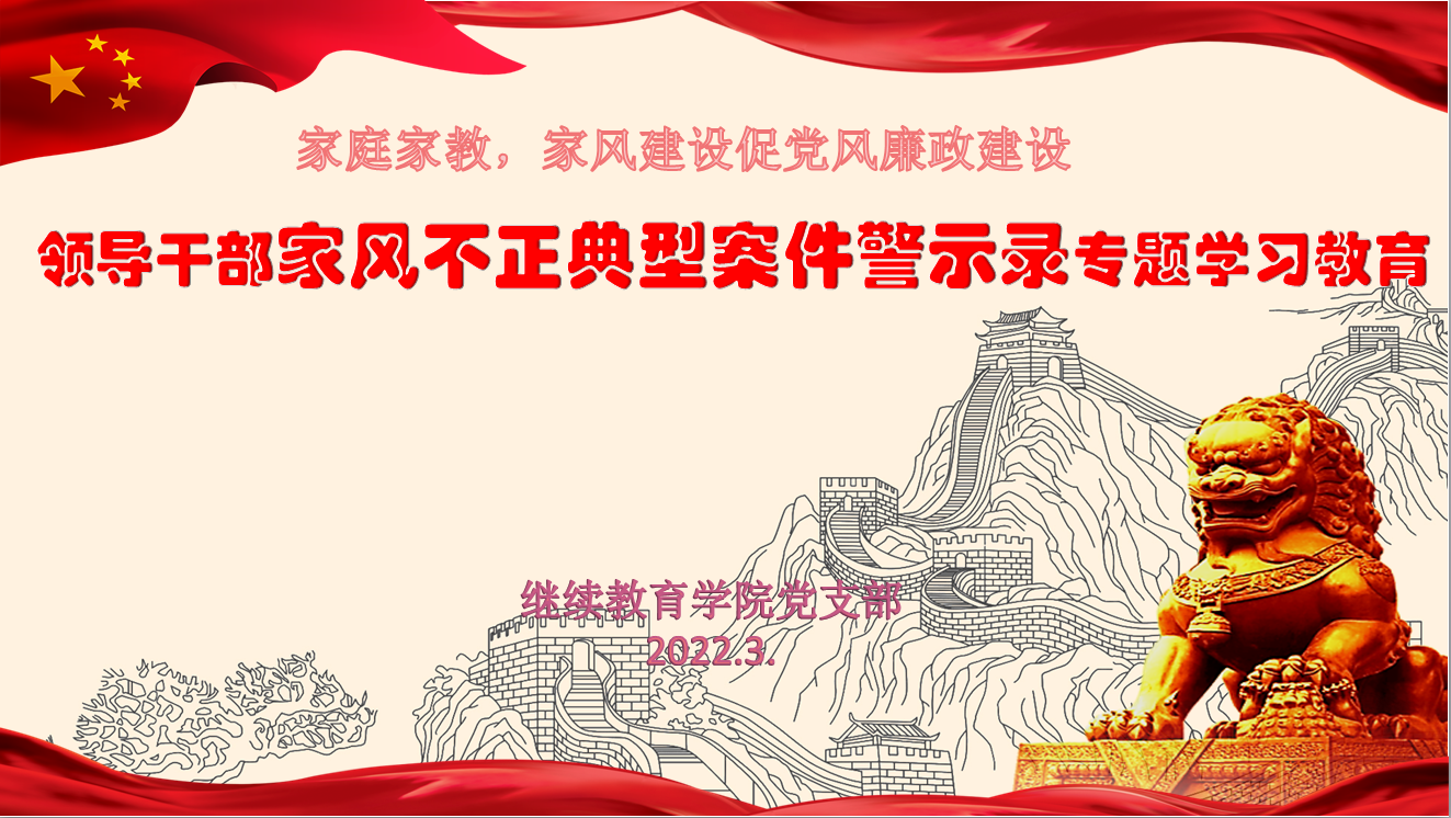 为深入开展清廉教育活动,提高党员干部的自身修养,营造清正廉洁的良好作风。2022年3月16日下午,继续教育学院党支部召开清廉教育主题党日活动—组织党员干部集中观看《家风不正遗祸患 清廉传家惠久远——领导干部家风不正典型案件警示录》警示教育电教片。