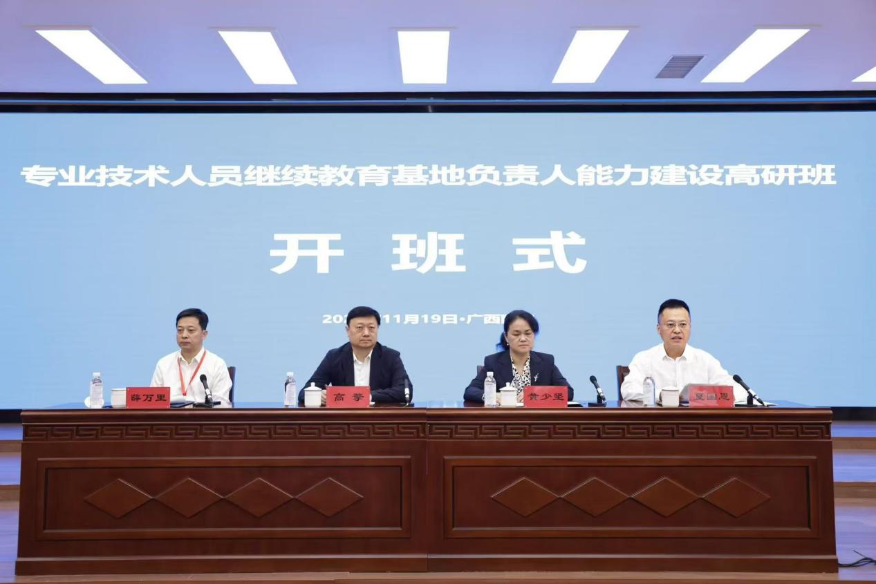 11月19上午,由人力资源和社会保障部举办的国家专业技术人员继续教育基地负责人能力建设高研班在我校开班。人力资源和社会保障部专业技术人员管理司二级巡视员高擎,广西壮族自治区人力资源和社会保障厅二级巡视员黄少坚,校党委常委、副校长夏国恩出席开班式。开班式由人力资源和社会保障部事业单位人事服务中心副主任薛万里主持。