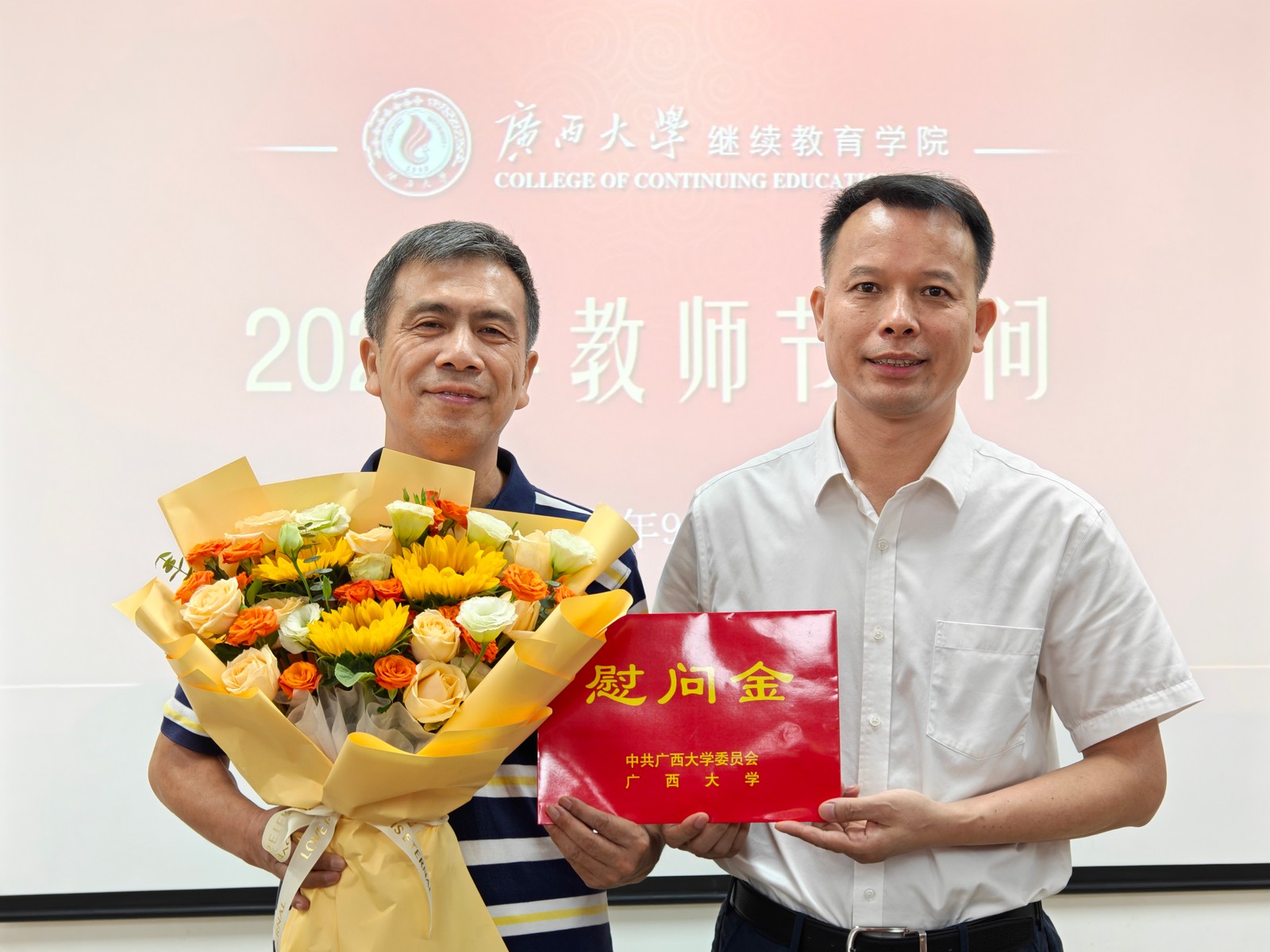 继续教育学院慰问教师代表 2024年9月10日是我国第40个教师节。9月9日,继续教育学院领导班子代表学校慰问学院在职教师代表,向他们送上鲜花并致以节日祝贺,代表学校倾听教师意见建议,传达学校关怀温暖。(陈昊宇/图) 慰问座谈代表合影 慰问黄秀萍老师 慰问马振辉老师 一审一校:陈昊宇 二审二校:陈义群 三审三校:谭鸿禹