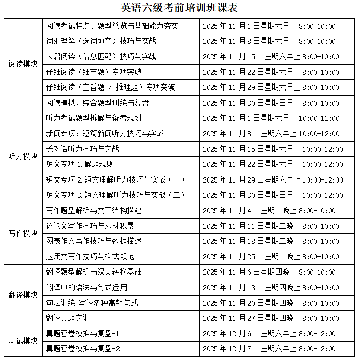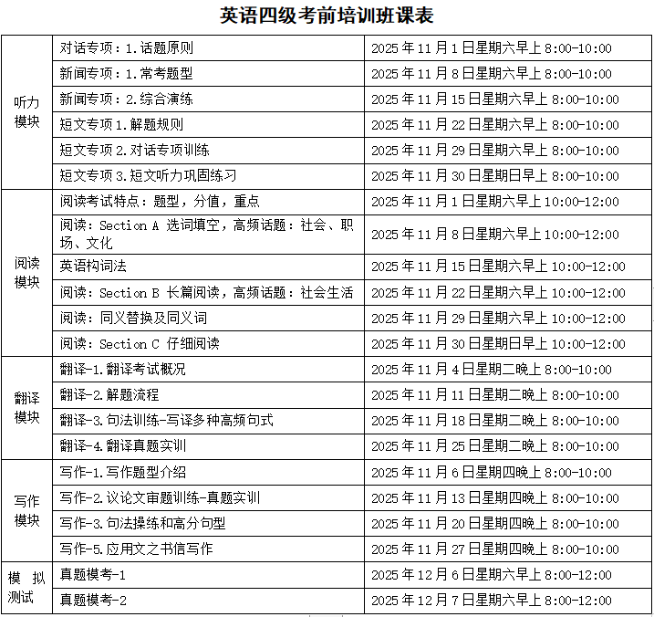英语作为国际交流的重要工具,在教育和职业发展中扮演着越来越重要的角色。大学英语四、六级考试(CET-4/6)不仅是衡量大学生英语水平的重要标准,也是许多企事业单位招聘时参考的重要指标之一。 为帮助广大学生顺利通过大学英语四、六级考试,提升英语综合应用能力,广西大学继续教育学院特别推出“大学英语四、六级考前培训班”。该项目旨在为应考学生提供系统化、个性化的学习方案,为顺利通过考试助力。 【培训目标】 帮助学员掌握大学英语四、六级考试的核心知识点和解题技巧。 提升学员在听力、阅读、写作及翻译等各方面的应试能力。 助力学员备考大学英语四、六级,取得理想成绩。 【培训内容】 听力专项:强化训练,习得技巧,提升分数 阅读专项:打破传统,掌握方法,争取高分 写作专项:活用模板,巧用句型,优化结构 翻译专项:逻辑转换,转变思维,着重产出 测试点评:全真试题,定位短板,科学提升 【培训对象】 1.广西大学在读本科生和研究生; 2.南宁市内高校在读本专科生和研究生。 【培训方式】 线上线下混合教学:线上平台提供丰富的教学资源,方便学员随时复习和练习重点知识;线下课堂开展面授教学,包括知识点讲解、小组讨论、课堂练习等。 小班教学:每班学员控制在30人左右,确保教师能够关注到每位学员的学习情况,提供个性化指导。 【培训时间】 培训周期为5周,共48个课时,每次课50分钟。课程主要安排在周末及课余时间。计划2025年11月1日开课,12月7日结课。 【收费标准】 大学英语四级考前培训班:1580元/人/期。 大学英语六级考前培训班:1880元/人/期。 【联系方式】 咨询报名热线:0771-3235605 李老师 报名地址:广西大学继续教育学院210办公室 咨询二维码 报名二维码 一审一校:李 勇 二审二校:梁海萍 三审三校:邓珍琪