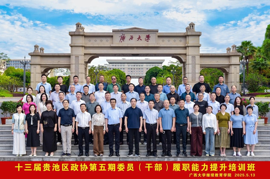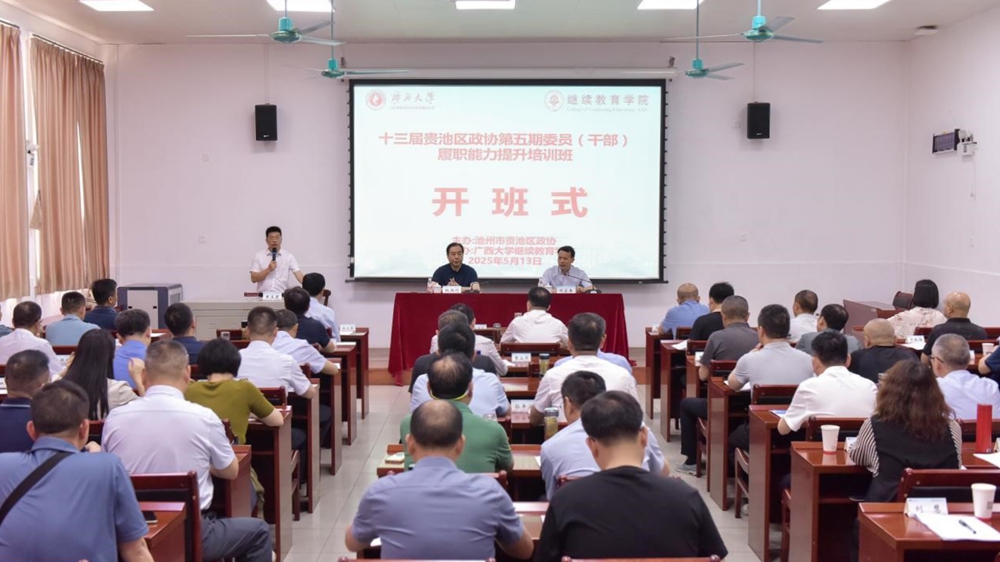 2025年5月13日,十三届贵池区政协第五期委员(干部)履职能力提升培训班在我校开班。安徽省池州市贵池区政协党组书记、主席鲍胜利,广西大学继续教育学院院长闭富春出席开班式。