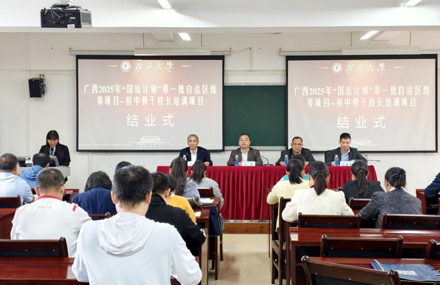 “国培计划”是落实《教育强国建设规划纲要(2024—2035年)》的重大实践。2025年10月24日,由广西壮族自治区教师培训中心主办,广西大学承办的2025年“国培计划”第一批自治区统筹项目——初中骨干校长培训班在我校结业。广西大学继续教育学院副院长徐华出席结业仪式并讲话。
